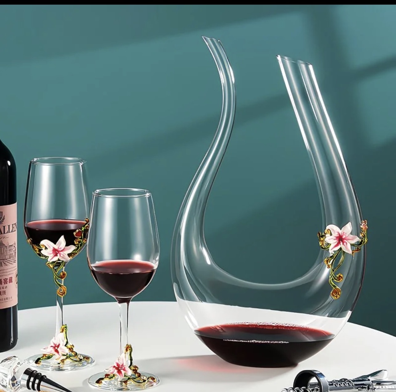 Elegant swan-shaped glass decanter with matching wine glass with beautiful floral detailing for a luxury finish.